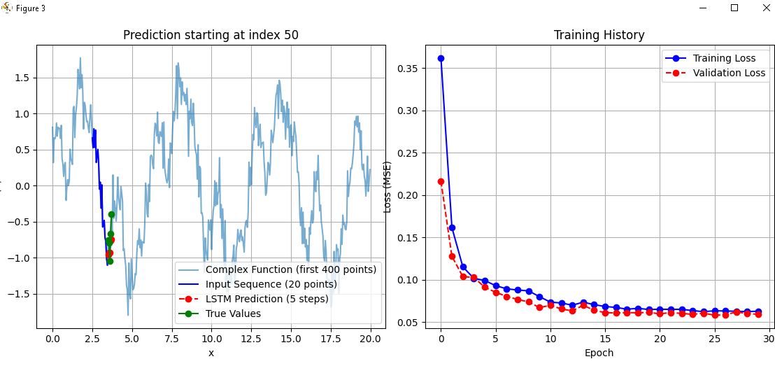 # -*- coding: utf-8 -*- """ Created on Wed Sep 24 20:17:56 2025 @author: dev66 """ # -*- coding: utf-8 -*- """ Created on Wed Sep 24 20:09:38 2025 @author: dev66 Description: ------------ This program builds and trains an LSTM model to predict the next 5 points of a more complex periodic function (sine + cosine + sine mix + noise). It then visualizes: - The first part of the function (default: 400 points) - The input sequence window - The predicted vs. true next 5 points - Training history (loss curves) """ import numpy as np import matplotlib.pyplot as plt from tensorflow.keras.models import Sequential from tensorflow.keras.layers import LSTM, Dense, Input # ========================================================== # 1. Generate dataset function (with noise parameter) # ========================================================== def generate_function(x, noise_level=0.0): """ Generate a complex function with optional Gaussian noise. f(x) = sin(x) + 0.5*cos(3x) + 0.3*sin(5x) + noise Parameters ---------- x : np.ndarray Input values. noise_level : float Standard deviation of Gaussian noise to add. Returns ------- np.ndarray Generated data with noise. """ base = np.sin(x) + 0.5*np.cos(3*x) + 0.3*np.sin(5*x) noise = noise_level * np.random.randn(len(x)) return base + noise # Generate data x = np.linspace(0, 100, 2000) # 2000 points data = generate_function(x, noise_level=0.2) # adjust noise_level here # ========================================================== # 2. Prepare training sequences # ========================================================== window_size = 20 # input: 20 past points predict_ahead = 5 # output: 5 future points X, y = [], [] for i in range(len(data) - window_size - predict_ahead): X.append(data[i:i+window_size]) y.append(data[i+window_size:i+window_size+predict_ahead]) X = np.array(X) y = np.array(y) # Reshape for LSTM: (samples, timesteps, features) X = X.reshape((X.shape[0], X.shape[1], 1)) # ========================================================== # 3. Build the LSTM model # ========================================================== model = Sequential() model.add(Input(shape=(window_size, 1))) model.add(LSTM(64, activation='tanh')) # 64 units for more capacity model.add(Dense(predict_ahead)) # output = 5 points model.compile(optimizer='adam', loss='mse') # ========================================================== # 4. Train the model # ========================================================== history = model.fit(X, y, epochs=30, verbose=1, validation_split=0.2) # ========================================================== # 5. Flexible prediction function # ========================================================== def predict_from_index(model, data, x, start_index, window_size, predict_ahead): """ Use a trained model to predict 'predict_ahead' values starting from a given index in the dataset. Plots results and training history. """ start_seq = data[start_index:start_index + window_size] test_input = start_seq.reshape((1, window_size, 1)) prediction = model.predict(test_input, verbose=0).flatten() true_future = data[start_index+window_size:start_index+window_size+predict_ahead] # ======== Plot ======== plt.figure(figsize=(15,5)) # (a) Function (first 400 points) + input + prediction plt.subplot(1,2,1) plt.plot(x[:400], data[:400], label="Complex Function (first 400 points)", alpha=0.6) plt.plot(x[start_index:start_index+window_size], start_seq, 'b', label="Input Sequence (20 points)") plt.plot(x[start_index+window_size:start_index+window_size+predict_ahead], prediction, 'ro--', label="LSTM Prediction (5 steps)") plt.plot(x[start_index+window_size:start_index+window_size+predict_ahead], true_future, 'g-o', label="True Values") plt.title(f"Prediction starting at index {start_index}") plt.xlabel("x") plt.ylabel("f(x)") plt.legend() plt.grid(True) # (b) Training history plt.subplot(1,2,2) plt.plot(history.history['loss'], 'b-o', label="Training Loss") plt.plot(history.history['val_loss'], 'r--o', label="Validation Loss") plt.title("Training History") plt.xlabel("Epoch") plt.ylabel("Loss (MSE)") plt.legend() plt.grid(True) plt.tight_layout() plt.show() return prediction, true_future # ========================================================== # 6. Example usage # ========================================================== start_index = 50 # try values <= 180 so it's visible in first 200 points prediction, true_future = predict_from_index(model, data, x, start_index, window_size, predict_ahead) print(f"\nPrediction from index {start_index+window_size} " f"to {start_index+window_size+predict_ahead-1}:") print("Predicted:", prediction) print("True :", true_future) |
